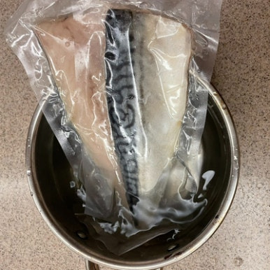 먼저, 냉동 고등어를 팩채로 찬물에 넣어서 해동시킵니다. 고등어는 20분 이내로 금방 해동되니 너무 오랫동안 해동하지 마세요!